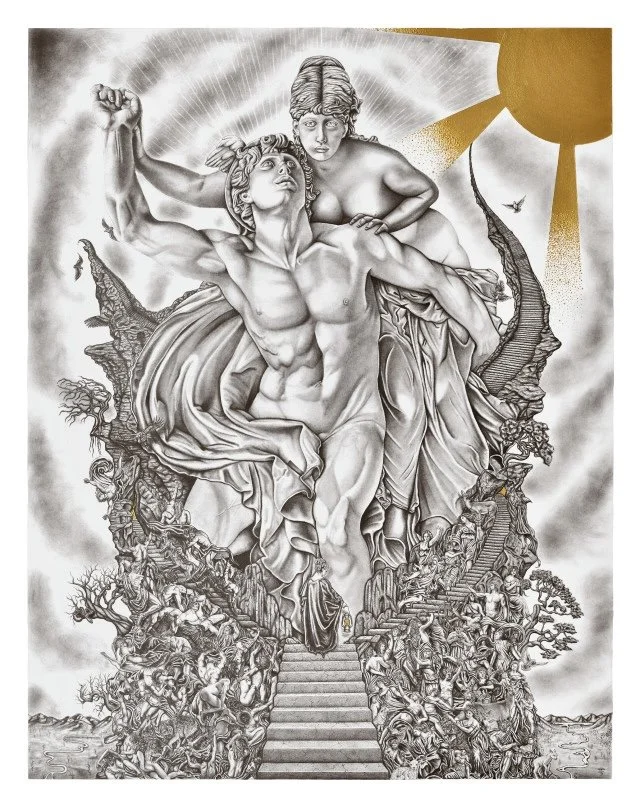 About: A drawing inspired by Led Zeppelin’s legendary “Stairway to Heaven.” A song of such profound depth demands nothing less than an intricate portrayal. This piece includes over 100 references from humans to animals, to plants, all fitting together to form the story this song so beautifully tells.